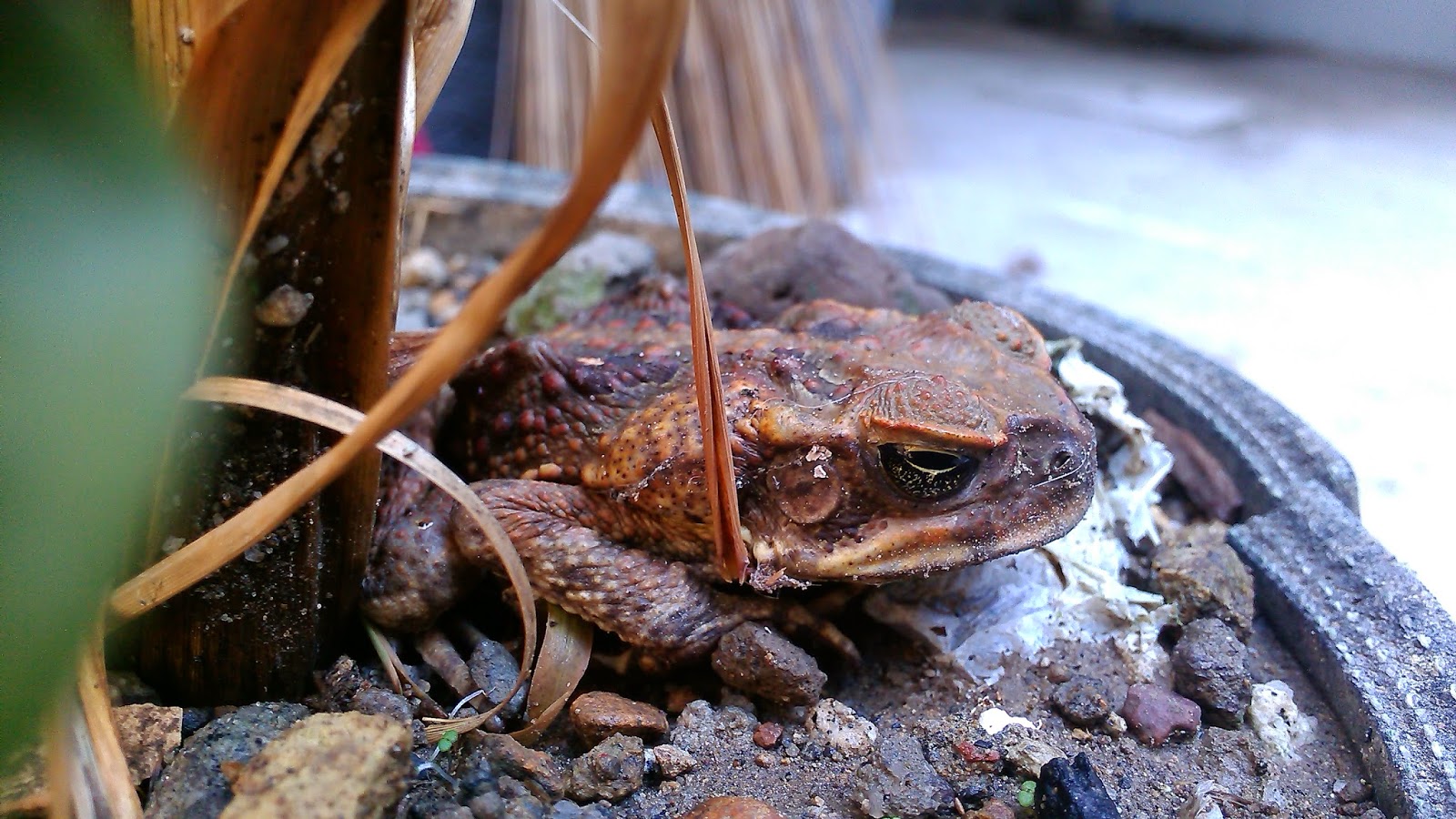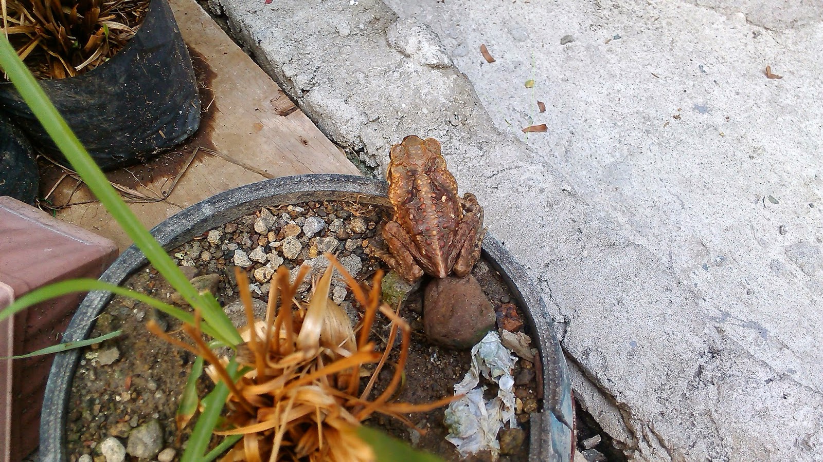 He seem to have found a temporary resting place under my lemongrass. He was maybe waiting for his meal to come by last night but looks like things did not go well for him by the way he looks.