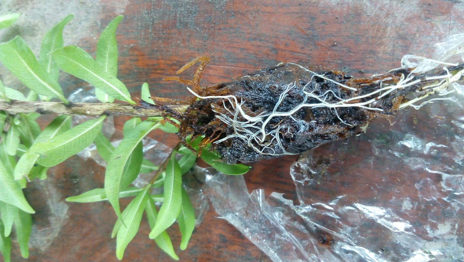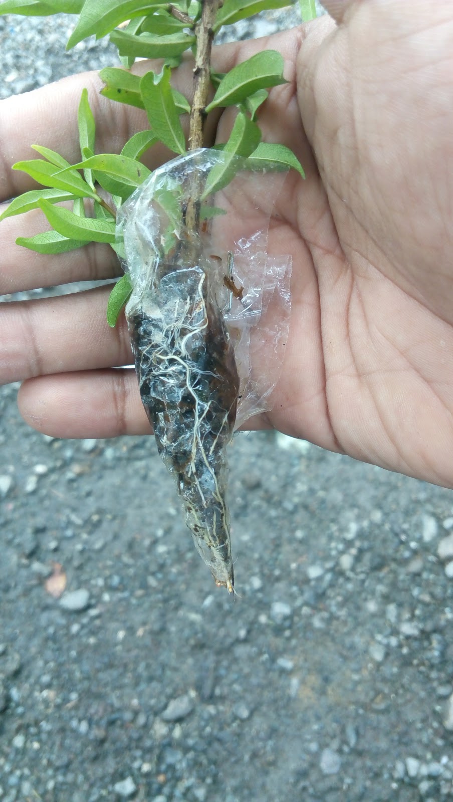 This is the result of my first attempt to air layer a Sui Mei or Water Jasmine (Wrightia religiosa). After about a month and a half, it has grown noticeable roots that reaches the surface. At this point, it must be ready to be planted in a separate pot and grow on its own as an individual tree.